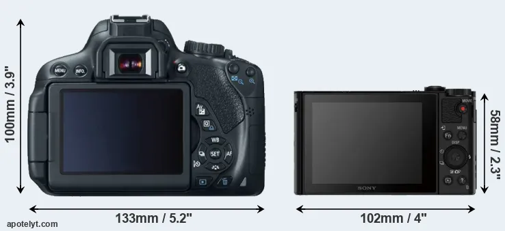 The physical size and weight of the Canon 650D and the Sony HX80 are illustrated in the side-by-side display below. The two cameras are presented according to their relative size. Three successive views from the front, the top, and the rear are shown. All width, height and depth measures are rounded to the nearest millimeter.