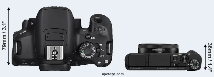 The physical size and weight of the Canon 650D and the Sony HX99 are illustrated in the side-by-side display below. The two cameras are presented according to their relative size. Three successive views from the front, the top, and the rear are shown. All width, height and depth measures are rounded to the nearest millimeter.
