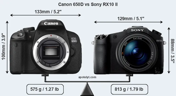 The side-by-side display below illustrates the physical size and weight of the Canon 650D and the Sony RX10 II. The two cameras are presented according to their relative size. Three consecutive perspectives from the front, the top, and the back are available. All width, height and depth measures are rounded to the nearest millimeter.