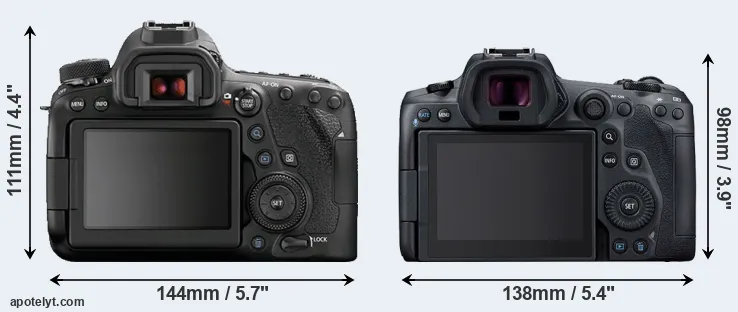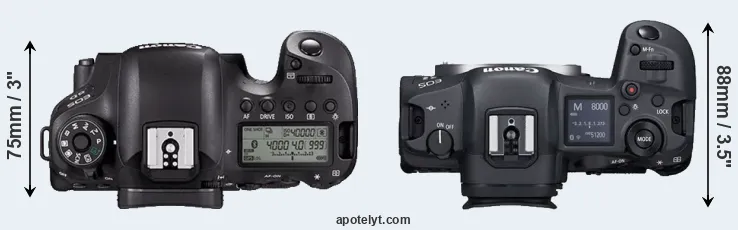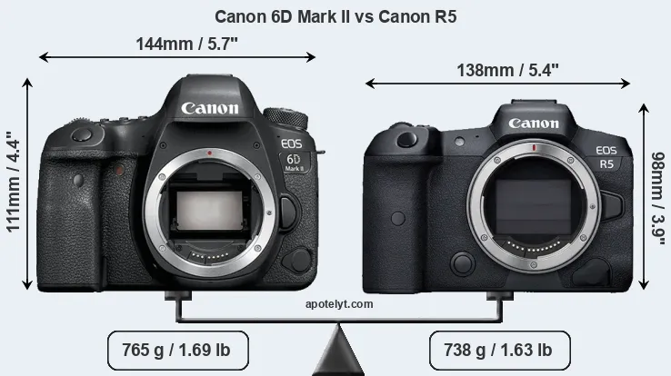 The side-by-side display below illustrates the physical size and weight of the Canon 6D Mark II and the Canon R5. The two cameras are presented according to their relative size. Three consecutive views from the front, the top, and the rear side are shown. All width, height and depth dimensions are rounded to the nearest millimeter.