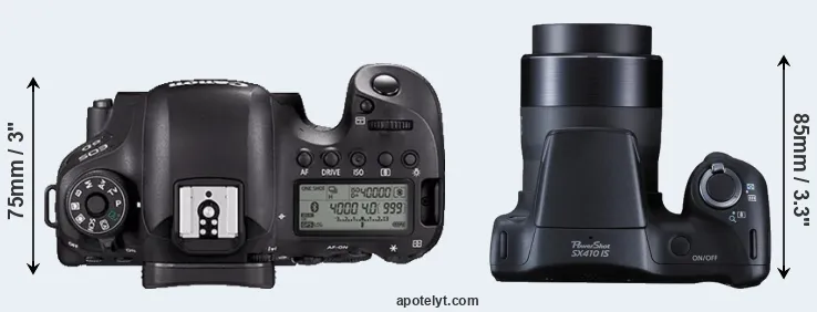The side-by-side display below illustrates the physical size and weight of the Canon 6D Mark II and the Canon SX410. The two cameras are presented according to their relative size. Three successive views from the front, the top, and the rear are shown. All width, height and depth measures are rounded to the nearest millimeter.