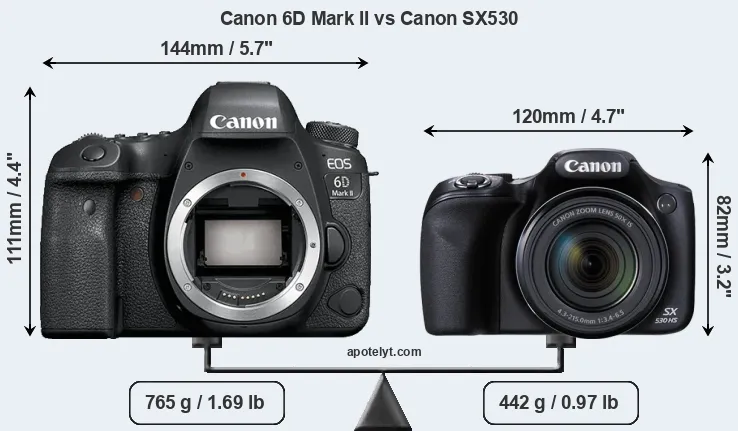 An illustration of the physical size and weight of the Canon 6D Mark II and the Canon SX530 is provided in the side-by-side display below. The two cameras are presented according to their relative size. Three consecutive perspectives from the front, the top, and the back are available. All size dimensions are rounded to the nearest millimeter.