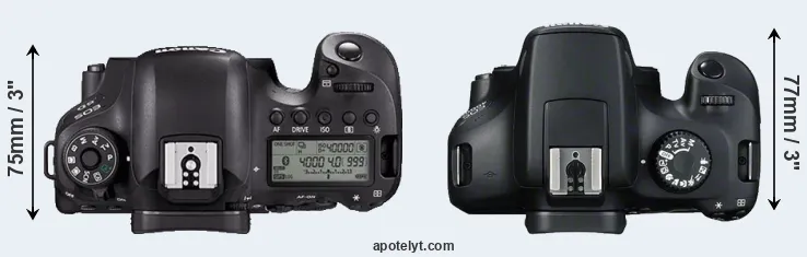 The side-by-side display below illustrates the physical size and weight of the Canon 6D Mark II and the Canon T100. The two cameras are presented according to their relative size. Three consecutive perspectives from the front, the top, and the back are available. All width, height and depth dimensions are rounded to the nearest millimeter.