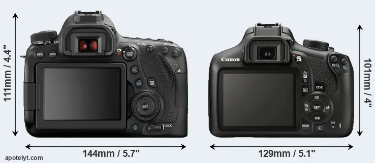 The physical size and weight of the Canon 6D Mark II and the Canon T6 are illustrated in the side-by-side display below. The two cameras are presented according to their relative size. Three consecutive perspectives from the front, the top, and the back are available. All width, height and depth dimensions are rounded to the nearest millimeter.