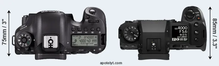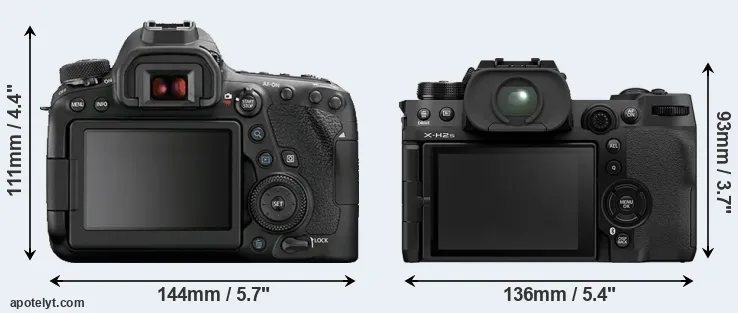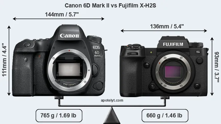 An illustration of the physical size and weight of the Canon 6D Mark II and the Fujifilm X-H2S is provided in the side-by-side display below. The two cameras are presented according to their relative size. Three successive views from the front, the top, and the rear are shown. All width, height and depth dimensions are rounded to the nearest millimeter.
