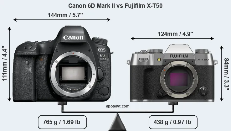 An illustration of the physical size and weight of the Canon 6D Mark II and the Fujifilm X-T50 is provided in the side-by-side display below. The two cameras are presented according to their relative size. Three consecutive perspectives from the front, the top, and the back are available. All width, height and depth dimensions are rounded to the nearest millimeter.