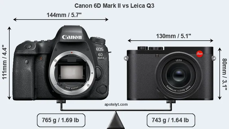 The side-by-side display below illustrates the physical size and weight of the Canon 6D Mark II and the Leica Q3. The two cameras are presented according to their relative size. Three consecutive perspectives from the front, the top, and the back are available. All size dimensions are rounded to the nearest millimeter.