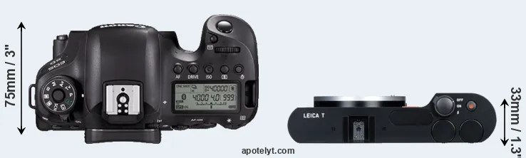 The side-by-side display below illustrates the physical size and weight of the Canon 6D Mark II and the Leica T. The two cameras are presented according to their relative size. Three successive views from the front, the top, and the rear are shown. All size dimensions are rounded to the nearest millimeter.