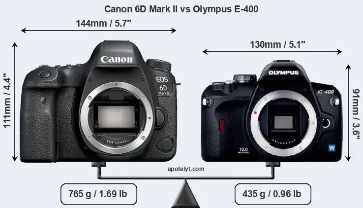 The physical size and weight of the Canon 6D Mark II and the Olympus E-400 are illustrated in the side-by-side display below. The two cameras are presented according to their relative size. Three consecutive views from the front, the top, and the rear side are shown. All width, height and depth dimensions are rounded to the nearest millimeter.
