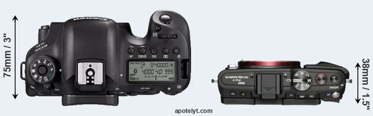 The side-by-side display below illustrates the physical size and weight of the Canon 6D Mark II and the Olympus E-PL6. The two cameras are presented according to their relative size. Three consecutive perspectives from the front, the top, and the back are available. All width, height and depth measures are rounded to the nearest millimeter.