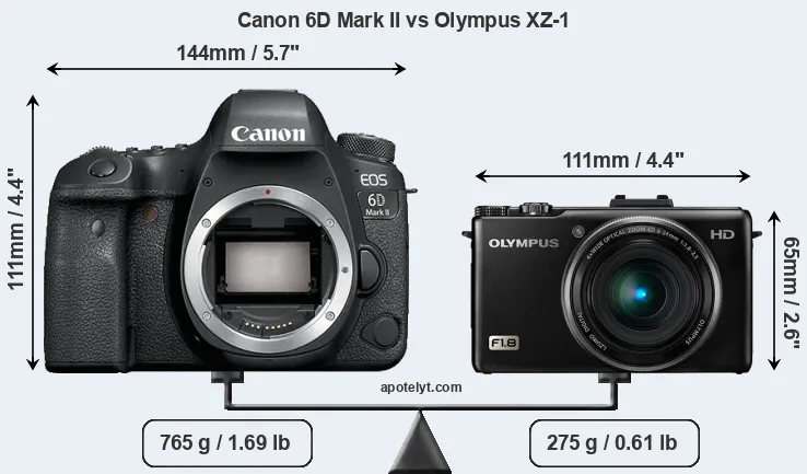 An illustration of the physical size and weight of the Canon 6D Mark II and the Olympus XZ-1 is provided in the side-by-side display below. The two cameras are presented according to their relative size. Three consecutive perspectives from the front, the top, and the back are available. All width, height and depth measures are rounded to the nearest millimeter.