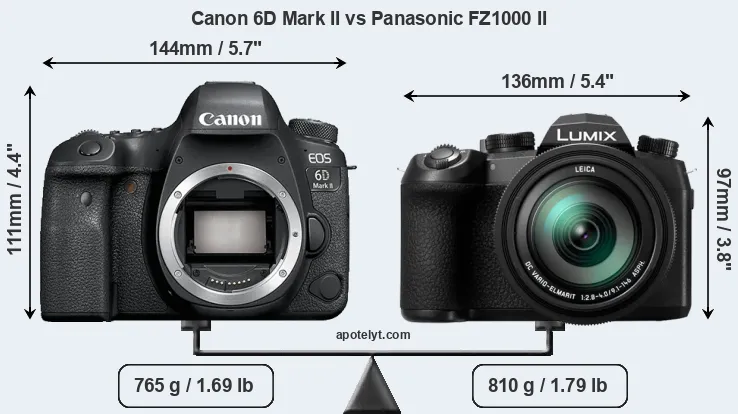 The side-by-side display below illustrates the physical size and weight of the Canon 6D Mark II and the Panasonic FZ1000 II. The two cameras are presented according to their relative size. Three consecutive perspectives from the front, the top, and the back are available. All size dimensions are rounded to the nearest millimeter.