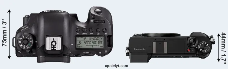 The physical size and weight of the Canon 6D Mark II and the Panasonic GX80 are illustrated in the side-by-side display below. The two cameras are presented according to their relative size. Three consecutive perspectives from the front, the top, and the back are available. All width, height and depth dimensions are rounded to the nearest millimeter.