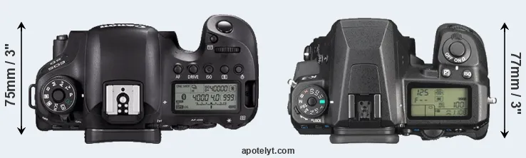 The side-by-side display below illustrates the physical size and weight of the Canon 6D Mark II and the Pentax K-3. The two cameras are presented according to their relative size. Three consecutive views from the front, the top, and the rear side are shown. All size dimensions are rounded to the nearest millimeter.
