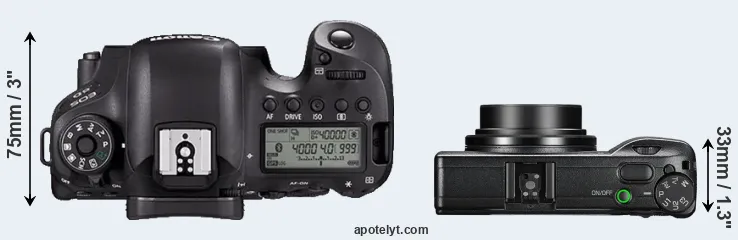 The side-by-side display below illustrates the physical size and weight of the Canon 6D Mark II and the Ricoh GR III. The two cameras are presented according to their relative size. Three consecutive views from the front, the top, and the rear side are shown. All width, height and depth dimensions are rounded to the nearest millimeter.