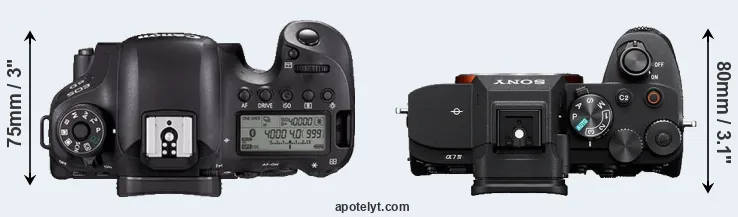 The side-by-side display below illustrates the physical size and weight of the Canon 6D Mark II and the Sony A7 IV. The two cameras are presented according to their relative size. Three consecutive views from the front, the top, and the rear side are shown. All width, height and depth measures are rounded to the nearest millimeter.
