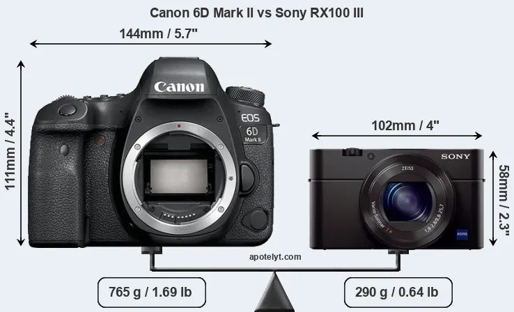 An illustration of the physical size and weight of the Canon 6D Mark II and the Sony RX100 III is provided in the side-by-side display below. The two cameras are presented according to their relative size. Three consecutive perspectives from the front, the top, and the back are available. All width, height and depth dimensions are rounded to the nearest millimeter.