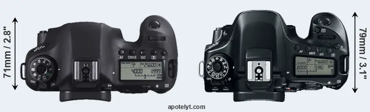 The physical size and weight of the Canon 6D and the Canon 80D are illustrated in the side-by-side display below. The two cameras are presented according to their relative size. Three successive views from the front, the top, and the rear are shown. All width, height and depth measures are rounded to the nearest millimeter.