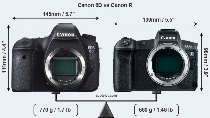 The side-by-side display below illustrates the physical size and weight of the Canon 6D and the Canon R. The two cameras are presented according to their relative size. Three consecutive perspectives from the front, the top, and the back are available. All width, height and depth dimensions are rounded to the nearest millimeter.