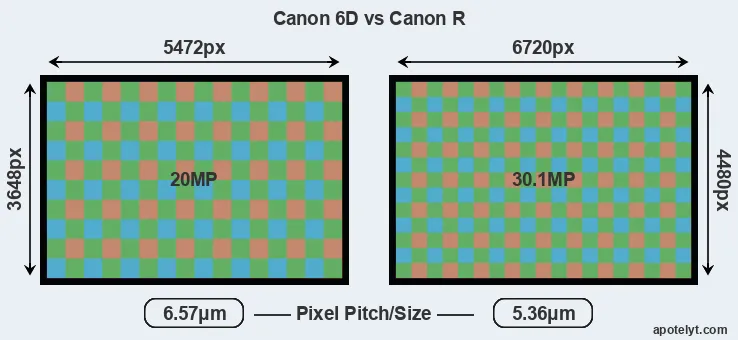 While the two cameras under review share the same sensor size, the Canon R offers a higher resolution of 30.1 megapixels, compared with 20 MP of the 6D. This megapixels advantage translates into a 23 percent gain in linear resolution. On the other hand, these sensor specs imply that the Canon R has a higher pixel density and a smaller size of the individual pixel (with a pixel pitch of 5.36μm versus 6.57μm for the 6D). However, it should be noted that the Canon R is much more recent (by 5 years and 11 months) than the 6D, and its sensor will have benefitted from technological advances during this time that compensate for the smaller pixel size.