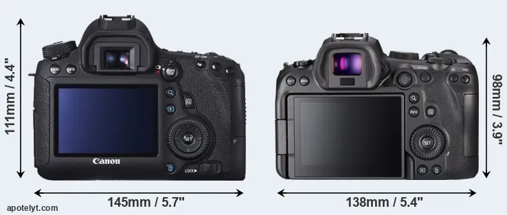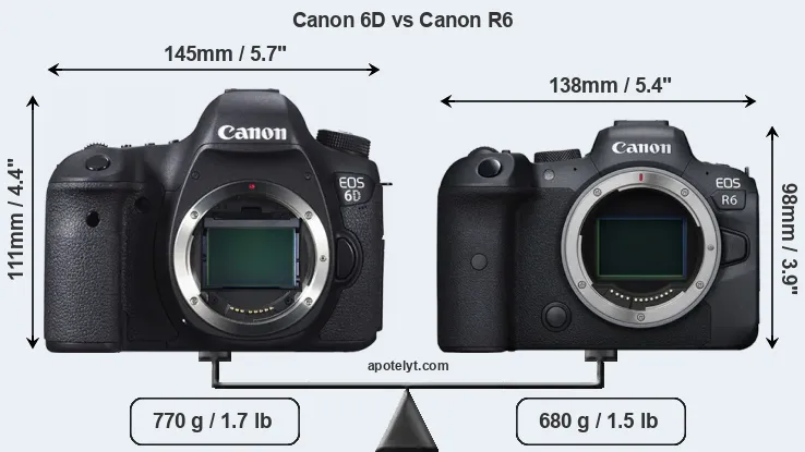 An illustration of the physical size and weight of the Canon 6D and the Canon R6 is provided in the side-by-side display below. The two cameras are presented according to their relative size. Three successive views from the front, the top, and the rear are shown. All size dimensions are rounded to the nearest millimeter.