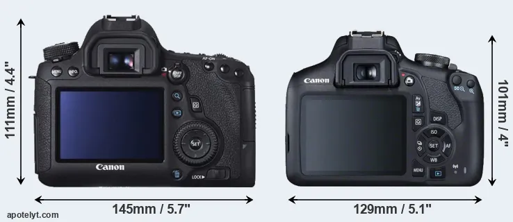 The side-by-side display below illustrates the physical size and weight of the Canon 6D and the Canon T7. The two cameras are presented according to their relative size. Three successive views from the front, the top, and the rear are shown. All width, height and depth dimensions are rounded to the nearest millimeter.