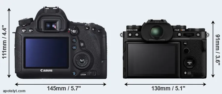 An illustration of the physical size and weight of the Canon 6D and the Fujifilm X-T5 is provided in the side-by-side display below. The two cameras are presented according to their relative size. Three consecutive perspectives from the front, the top, and the back are available. All width, height and depth measures are rounded to the nearest millimeter.