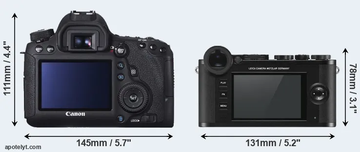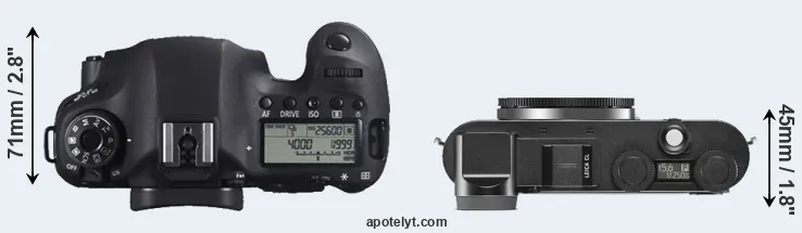 The side-by-side display below illustrates the physical size and weight of the Canon 6D and the Leica CL. The two cameras are presented according to their relative size. Three consecutive perspectives from the front, the top, and the back are available. All width, height and depth dimensions are rounded to the nearest millimeter.