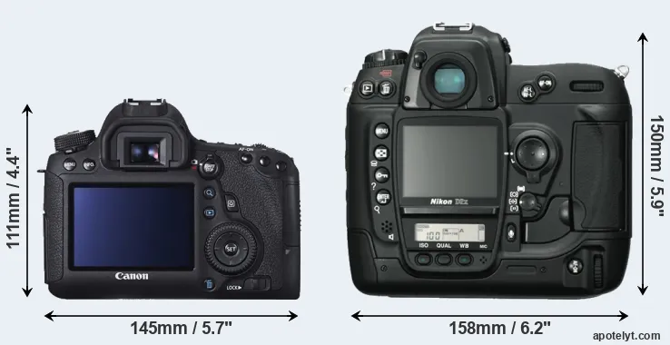 The physical size and weight of the Canon 6D and the Nikon D2X are illustrated in the side-by-side display below. The two cameras are presented according to their relative size. Three consecutive perspectives from the front, the top, and the back are available. All width, height and depth dimensions are rounded to the nearest millimeter.