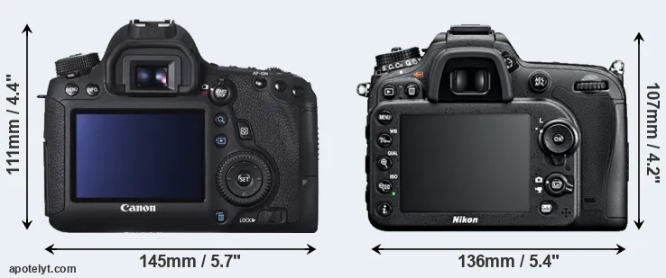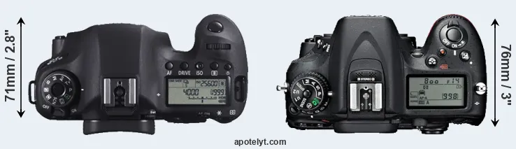 The side-by-side display below illustrates the physical size and weight of the Canon 6D and the Nikon D7100. The two cameras are presented according to their relative size. Three consecutive views from the front, the top, and the rear side are shown. All width, height and depth measures are rounded to the nearest millimeter.