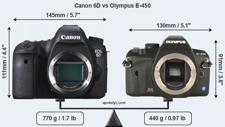 The side-by-side display below illustrates the physical size and weight of the Canon 6D and the Olympus E-450. The two cameras are presented according to their relative size. Three consecutive perspectives from the front, the top, and the back are available. All width, height and depth measures are rounded to the nearest millimeter.