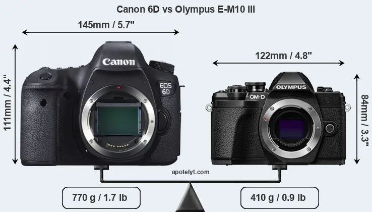 An illustration of the physical size and weight of the Canon 6D and the Olympus E-M10 III is provided in the side-by-side display below. The two cameras are presented according to their relative size. Three consecutive perspectives from the front, the top, and the back are available. All width, height and depth dimensions are rounded to the nearest millimeter.