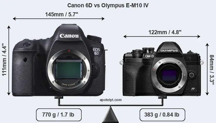 If the front view area (width x height) of the cameras is taken as an aggregate measure of their size, the Olympus E-M10 IV is considerably smaller (36 percent) than the Canon 6D. Moreover, the E-M10 IV is substantially lighter (50 percent) than the 6D. It is worth mentioning in this context that the 6D is splash and dust resistant, while the E-M10 IV does not feature any corresponding weather-sealing.