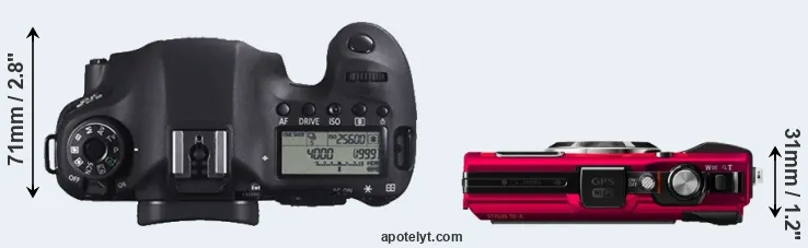 An illustration of the physical size and weight of the Canon 6D and the Olympus TG-4 is provided in the side-by-side display below. The two cameras are presented according to their relative size. Three consecutive views from the front, the top, and the rear side are shown. All width, height and depth measures are rounded to the nearest millimeter.