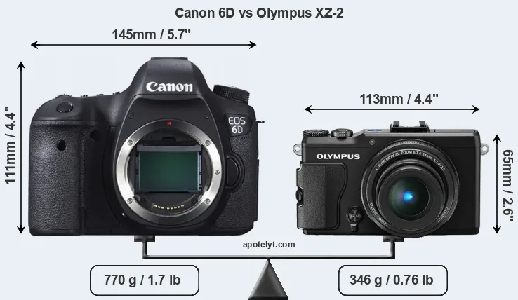 The physical size and weight of the Canon 6D and the Olympus XZ-2 are illustrated in the side-by-side display below. The two cameras are presented according to their relative size. Three consecutive perspectives from the front, the top, and the back are available. All width, height and depth measures are rounded to the nearest millimeter.