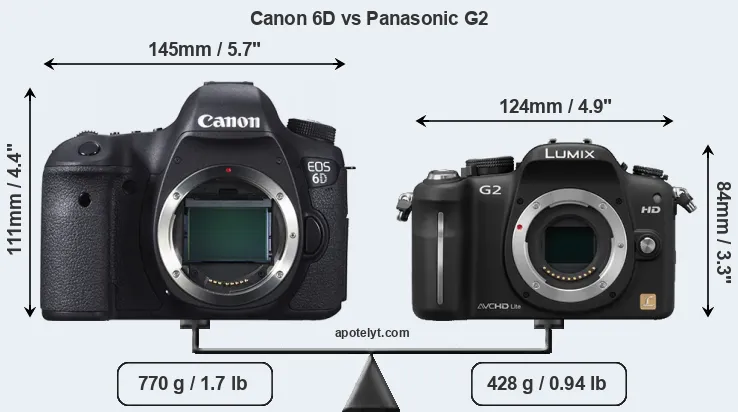The side-by-side display below illustrates the physical size and weight of the Canon 6D and the Panasonic G2. The two cameras are presented according to their relative size. Three successive views from the front, the top, and the rear are shown. All width, height and depth measures are rounded to the nearest millimeter.