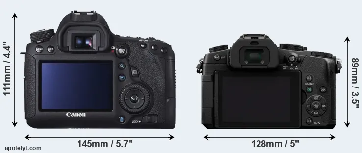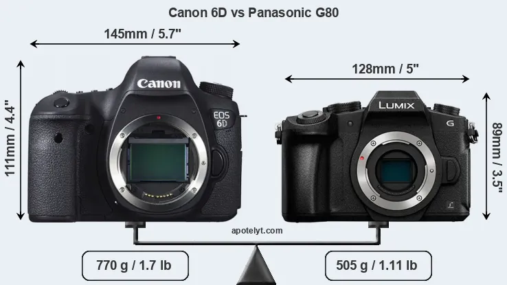 The physical size and weight of the Canon 6D and the Panasonic G80 are illustrated in the side-by-side display below. The two cameras are presented according to their relative size. Three consecutive perspectives from the front, the top, and the back are available. All width, height and depth dimensions are rounded to the nearest millimeter.