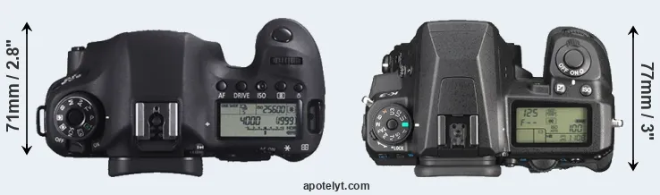 The physical size and weight of the Canon 6D and the Pentax K-3 are illustrated in the side-by-side display below. The two cameras are presented according to their relative size. Three consecutive views from the front, the top, and the rear side are shown. All size dimensions are rounded to the nearest millimeter.