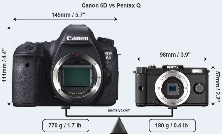 If the front view area (width x height) of the cameras is taken as an aggregate measure of their size, the Pentax Q is considerably smaller (65 percent) than the Canon 6D. Moreover, the Pentax Q is substantially lighter (77 percent) than the 6D. It is worth mentioning in this context that the 6D is splash and dust resistant, while the Pentax Q does not feature any corresponding weather-sealing.