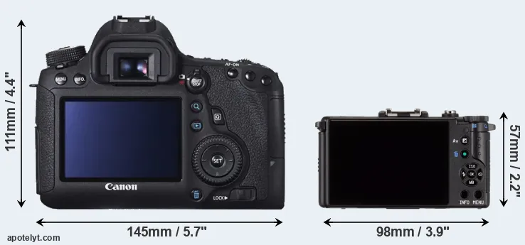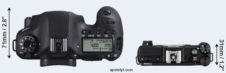 The physical size and weight of the Canon 6D and the Pentax Q are illustrated in the side-by-side display below. The two cameras are presented according to their relative size. Three consecutive perspectives from the front, the top, and the back are available. All size dimensions are rounded to the nearest millimeter.