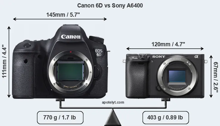 The side-by-side display below illustrates the physical size and weight of the Canon 6D and the Sony A6400. The two cameras are presented according to their relative size. Three successive views from the front, the top, and the rear are shown. All width, height and depth dimensions are rounded to the nearest millimeter.
