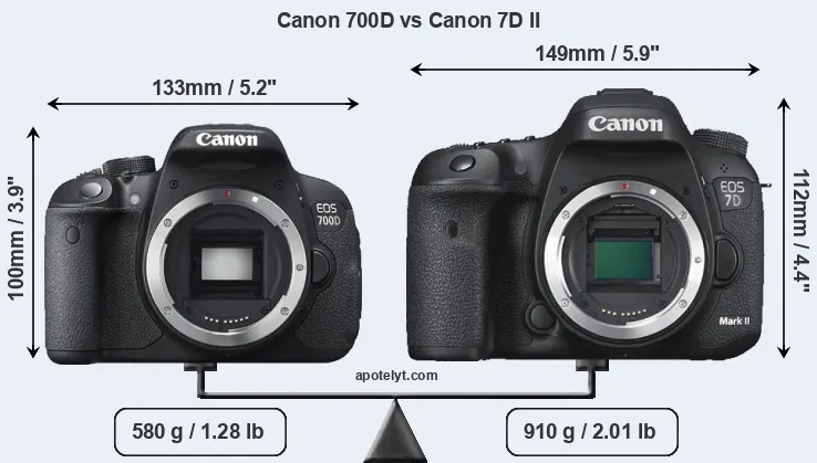 If the front view area (width x height) of the cameras is taken as an aggregate measure of their size, the Canon 7D II is notably larger (25 percent) than the Canon 700D. Moreover, the 7D Mark II is substantially heavier (57 percent) than the 700D. It is noteworthy in this context that the 7D Mark II is splash and dust-proof, while the 700D does not feature any corresponding weather-sealing.