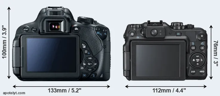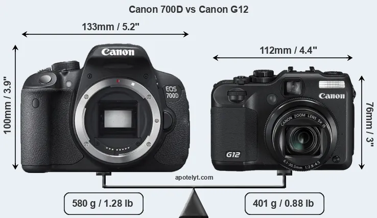 The physical size and weight of the Canon 700D and the Canon G12 are illustrated in the side-by-side display below. The two cameras are presented according to their relative size. Three consecutive views from the front, the top, and the rear side are shown. All width, height and depth measures are rounded to the nearest millimeter.