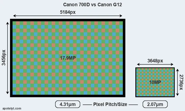 With 17.9MP, the 700D offers a higher resolution than the G12 (10MP), but the 700D nevertheless has larger individual pixels (pixel pitch of 4.31μm versus 2.07μm for the G12) due to its larger sensor. Moreover, the 700D is a much more recent model (by 2 years and 6 months) than the G12, and its sensor will have benefitted from technological advances during this time that further enhance the light gathering capacity of its pixels.