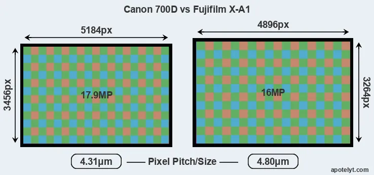 Despite having a smaller sensor, the Canon 700D offers a higher resolution of 17.9 megapixels, compared with 16 MP of the Fujifilm X-A1. This megapixels advantage comes at the cost of a higher pixel density and a smaller size of the individual pixel (with a pixel pitch of 4.31μm versus 4.80μm for the X-A1). Moreover, it should be noted that the X-A1 is a somewhat more recent model (by 5 months) than the 700D, and its sensor might have benefitted from technological advances during this time that further enhance the light gathering capacity of its pixel-units.