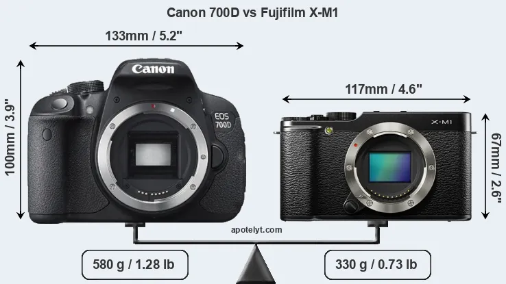 If the front view area (width x height) of the cameras is taken as an aggregate measure of their size, the Fujifilm X-M1 is considerably smaller (41 percent) than the Canon 700D. Moreover, the X-M1 is substantially lighter (43 percent) than the 700D. In this context, it is worth noting that neither the 700D nor the X-M1 are weather-sealed.