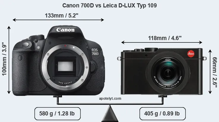The above size and weight comparisons are to some extent incomplete and possibly misleading, as the D-LUX Typ 109 has a lens built in, whereas the 700D is an interchangeable lens camera that requires a separate lens. Attaching the latter will add extra weight and bulk to the setup. You can compare the optics available for the 700D and their specifications in the Canon EF Lens Catalog.