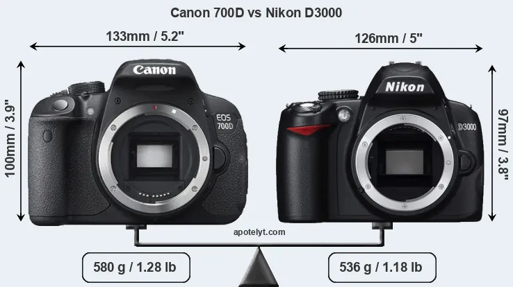 An illustration of the physical size and weight of the Canon 700D and the Nikon D3000 is provided in the side-by-side display below. The two cameras are presented according to their relative size. Three consecutive perspectives from the front, the top, and the back are available. All size dimensions are rounded to the nearest millimeter.