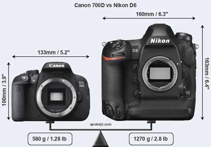 An illustration of the physical size and weight of the Canon 700D and the Nikon D6 is provided in the side-by-side display below. The two cameras are presented according to their relative size. Three consecutive views from the front, the top, and the rear side are shown. All width, height and depth measures are rounded to the nearest millimeter.