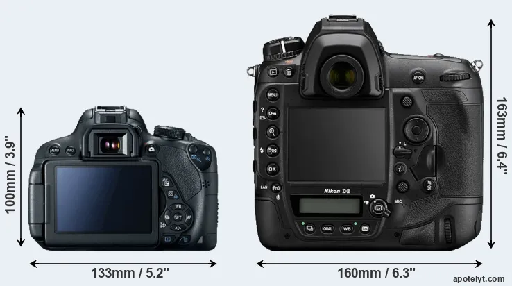 The above size and weight comparisons are to some extent incomplete since they do not consider the interchangeable lenses that both of these cameras require. A larger imaging sensor will tend to go along with bigger and heavier lenses, although exceptions exist. You can compare the optics available for the two cameras in the Canon EF Lens Catalog (700D) and the Nikon Lens Catalog (D6).